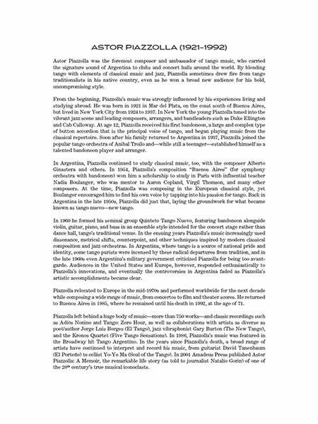 25 tangos by the revolutionary tango musician and composer Astor Piazzolla, arranged for cello and piano. These crowd-pleasing tangos borrow from classical, jazz, and Latin traditions. Includes Piazzolla's most famous tangos “Libertango” and “Oblivion.” Appropriate for the intermediate to early advanced player. Includes separate pull-out cello part.
