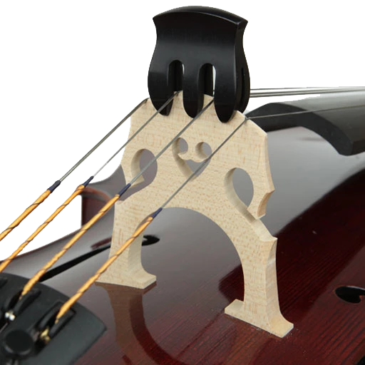 A three-prong wooden carved ebony performance mute which lightly mutes the sound of a full size cello, for orchestral playing. Similar to other orchestral mutes, however the mute is not secured to the strings below the bridge, instead placed directly on the bridge, with the strings in between the prongs.