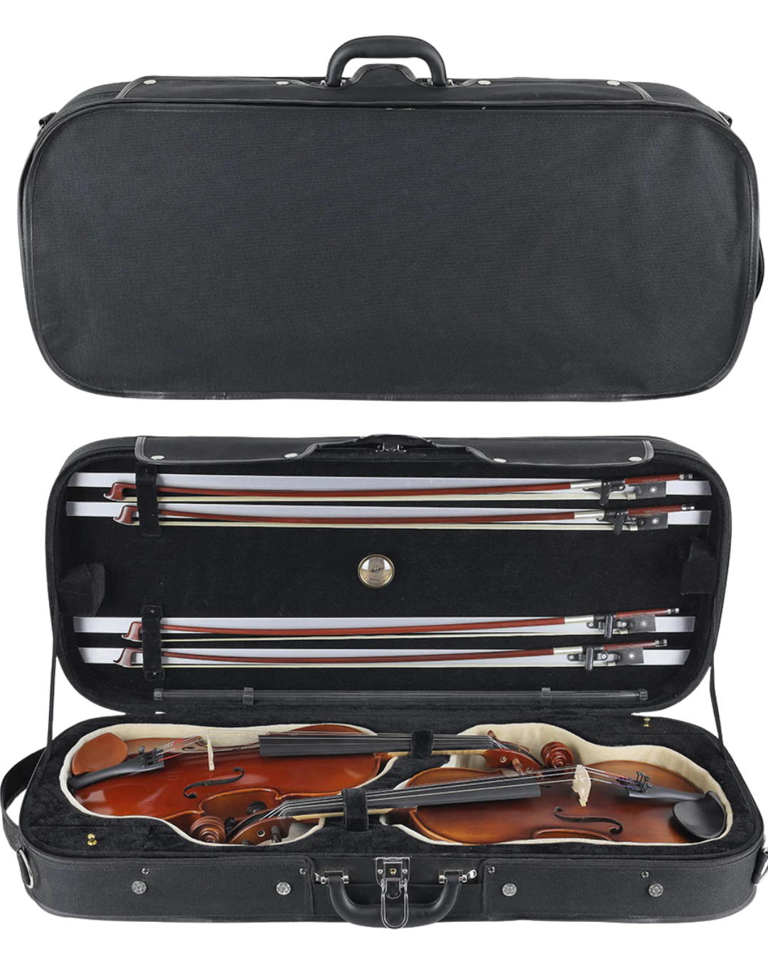 This Kreisler Double Violin Case allows you to carry two instruments in one. Color: Black with Beige interior only