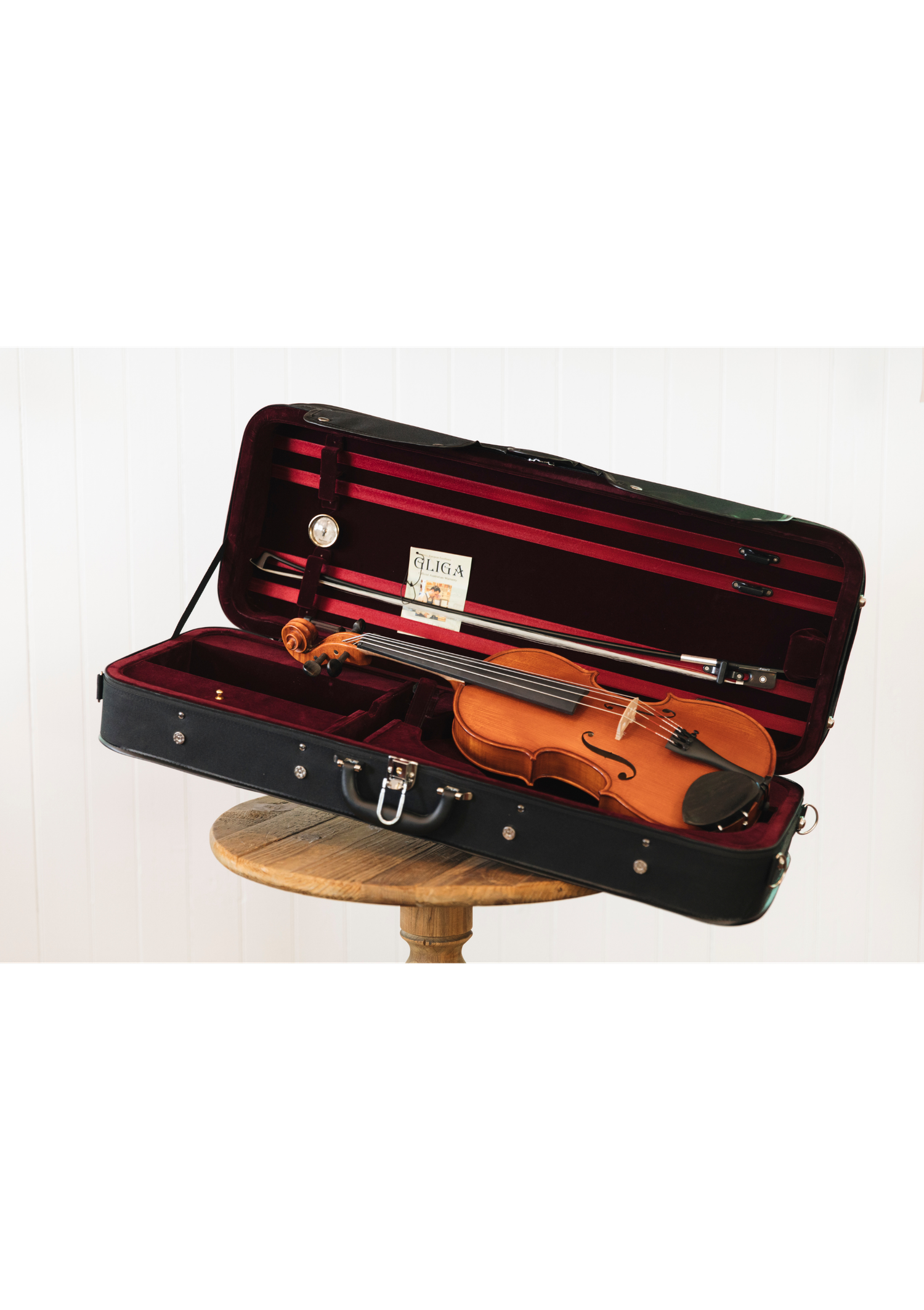 Intermediate student range handcrafted in Romanian workshops of Vasile Gliga. Features include flamed maple back, sides and neck and resonance spruce top. Body and scroll have rounded outline superior to series III. The oil varnish is hand applied and accessories are of a finer grade. Each instrument supplied with a quality wooden case and bow and fitted with Pirastro Violino strings.