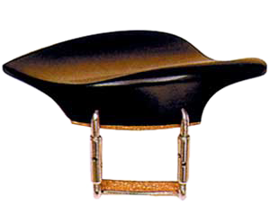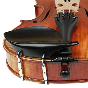 "Morawetz" style - Ebony. The Morawetz violin chinrest is made of ebony, and has a large flat cup which fits just to the side of and slightly over the tailpiece. This chinrest fits 3/4-4/4 sized violins only. To install, loosen up the brackets and rest the chinrest to the left of the tailpiece, as seen in the product picture. Following this, insert the tip of the chinrest tool into one of the little holes on the bracket, and turn to tighten. Repeat with the other bracket.