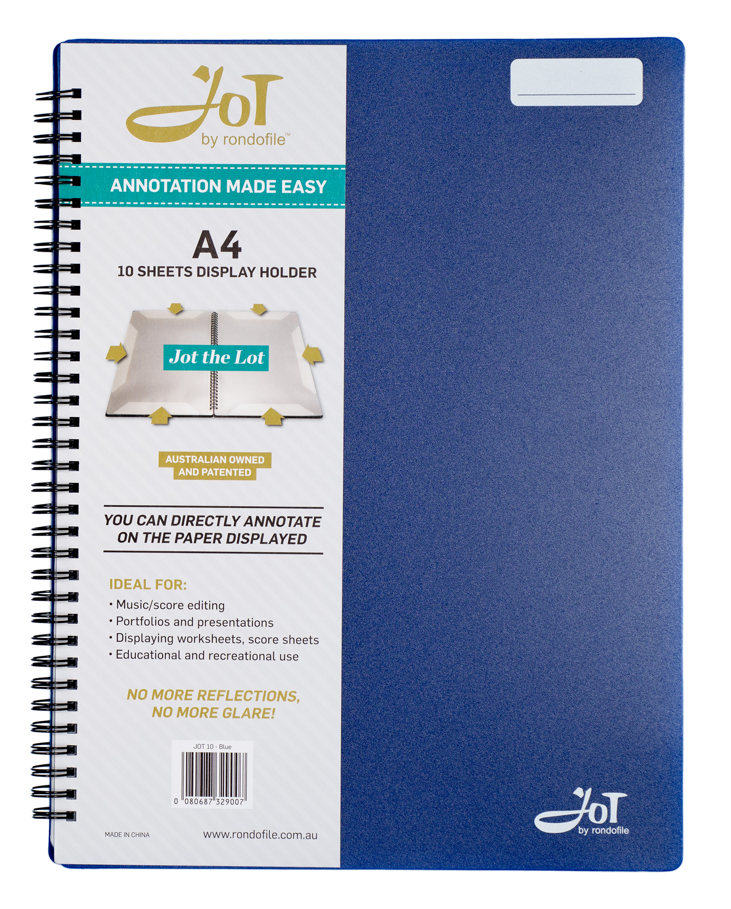 The JOT folder is a Rondofile 10 page display folder. The quality of the patented Rondofile sheets inside the JOT folder is the same high quality sheets as found in the Rondofile 20 & Rondofile 30 Display BOOK folders. Besides music, this product is design to provide a slimmer display filing folder for general all-purpose use, as well as for those musicians and all alike who do not require so many sheets.