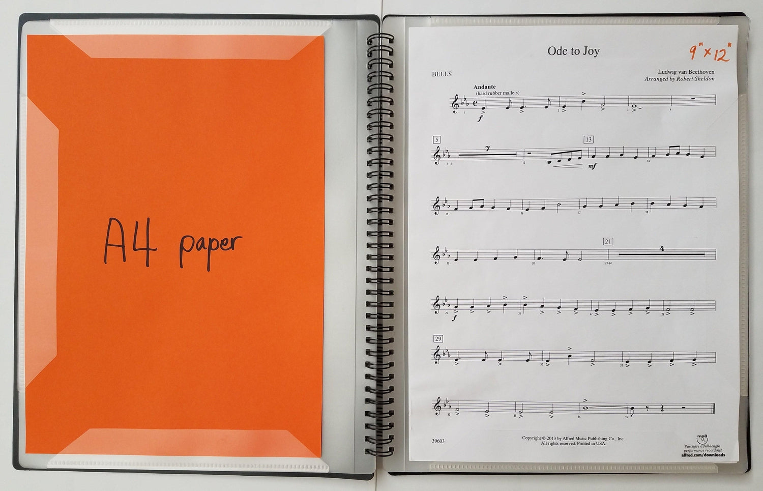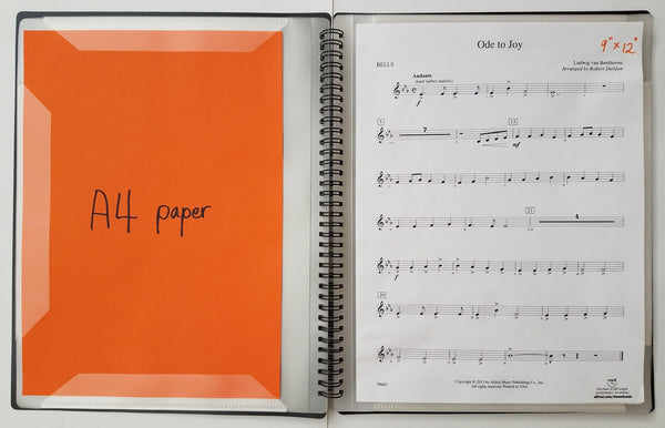 The Rondofile Plus 20 (20 sheets, black cover) is a specialised folder with larger than A4 sized Rondofile Sheets - 229mm x 305mm or 9 inch x 12 inch. The aim of this folder is to accommodate and fit the larger sized (American and Canadian) Orchestral and Band music scores and charts. Since it is slightly larger than A4, it can also accommodate A4 music sheets comfortably and snugly, which gives this folder an additional extra benefit.