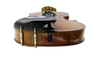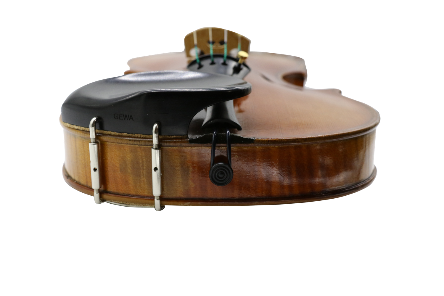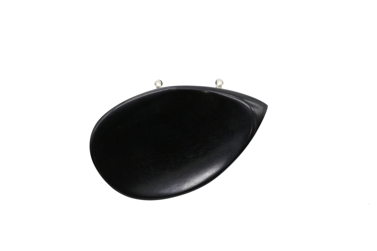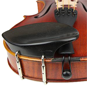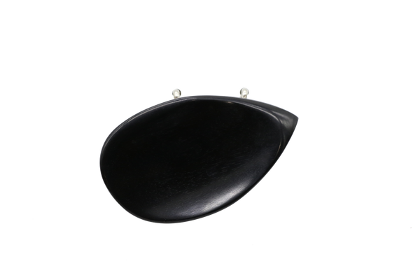 This Schmidt-style ebony chinrest fits 4/4 violins, with chrome fittings. It is made in Germany in the workshop of Reiner Wilfer. It has a arched plate, suitable for players who like to hold their violin further towards the middle, in comparison to the Dresden-style which lets the player place their chin further to the left. It is a large sized chinrest with a medium depth cup that mounts next to the tailpiece and extends slightly over it. The lip is nicely rounded, giving an arched effect. This chinrest sits to the left of the tailpiece, and can be screwed on using a chinrest tool. To install, loosen up the brackets and rest the chinrest to the left of the tailpiece, as seen in the product picture. Following this, insert the tip of the chinrest tool into one of the little holes on the bracket, and turn to tighten. Repeat with the other bracket.