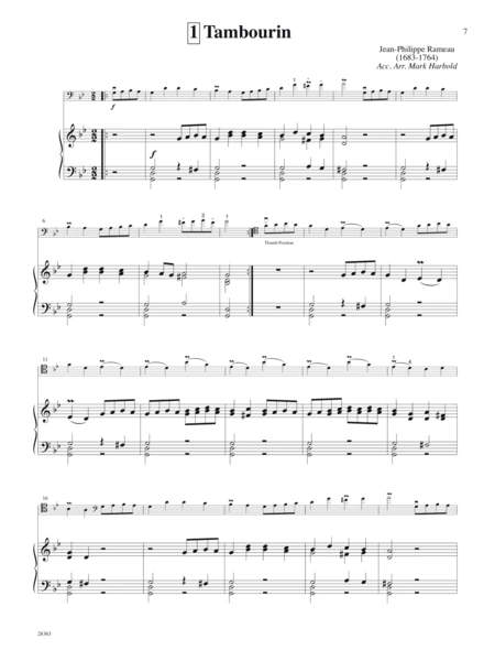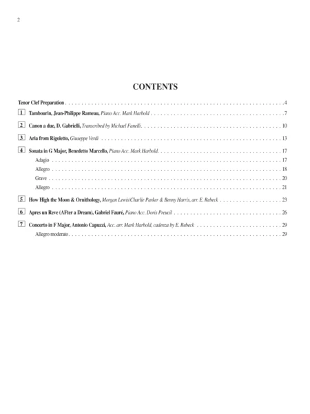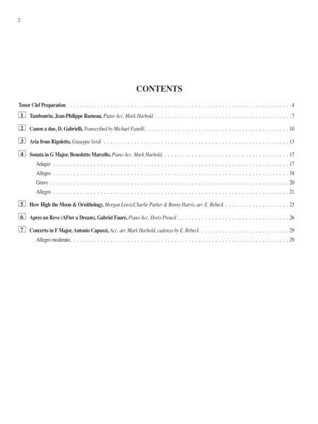 Titles: How High the Moon & Ornithology (Lewis/Parker and Harris, arr. Rebeck) * Apres un Reve (After a Dream) (Fauré, piano acc. Preucil) * Sonata in G Major (Adagio, Allegro, Grave, Allegro) (Marcello, piano acc. Harbold) * Tenor Clef Preparation * Tambourin (Rameau, piano acc. Harbold) * Canon a due (Gabrielli, transcribed by Fanelli) * Aria from Rigoletto (Verdi) * Concerto in F Major, Allegro moderato (Capuzzi, acc. arr. Harbold, cadenza by Rebeck).