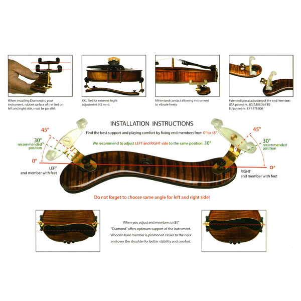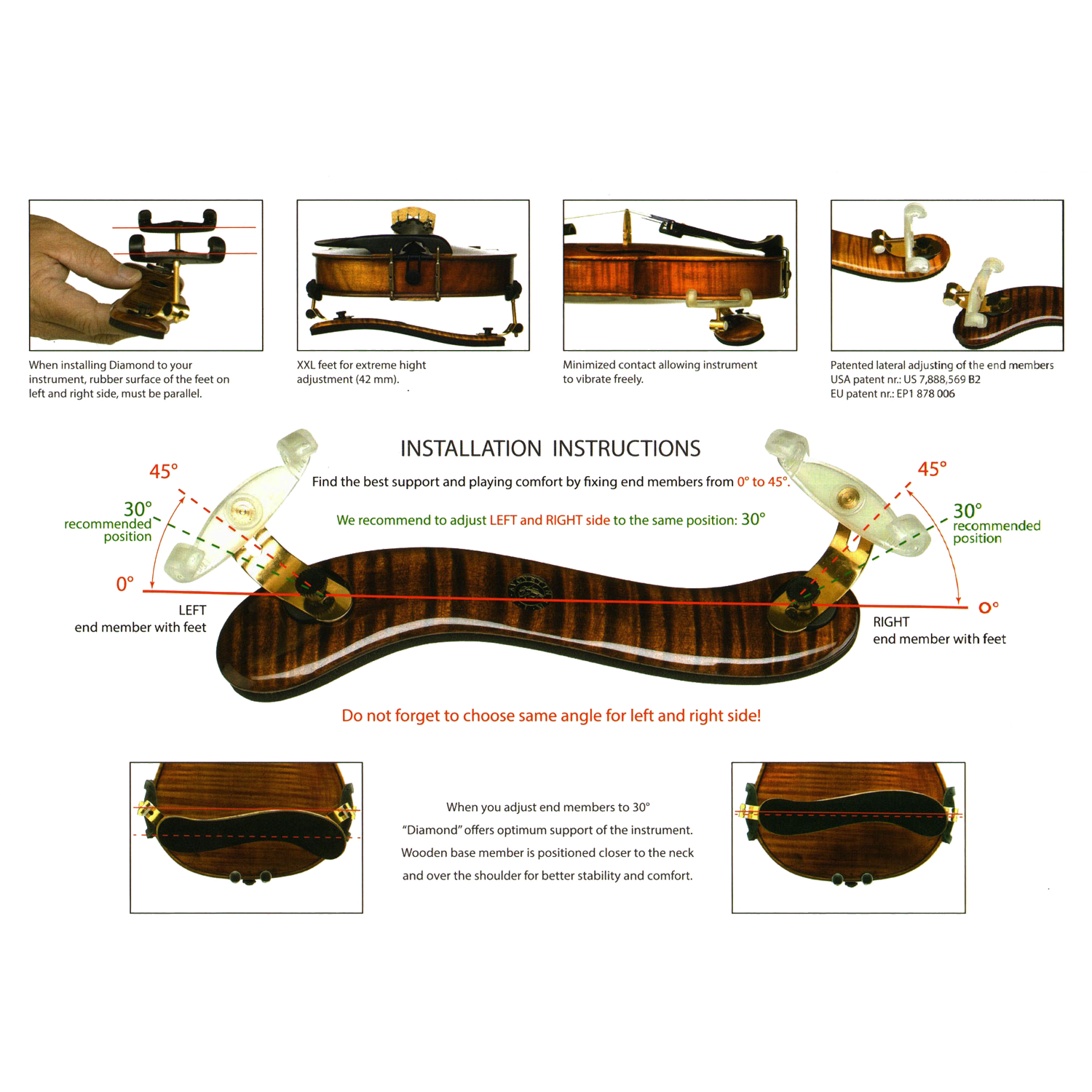 Ergonomically-designed solid wood Viva La Musica shoulder rests are fully adjustable for height and width, plus have a unique lateral adjustment system to allow a custom fit for your shoulder. Ribbed rubber feet secure the rest with minimum contact with your instrument, allowing for the best resonance and projection.